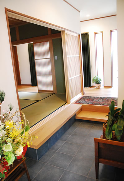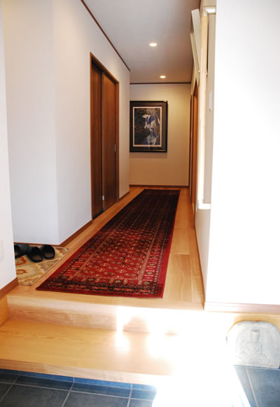 〇玄関は家の顔、玄関からは生活感は見えませんたたき部分を広く取りました。 玄関からは生活のスペースは見えないよう配慮しました。 |