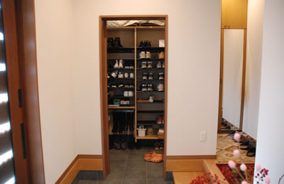 玄関にはたっぷりのウォークインシュークローゼットを設けました。 写真は引き戸を引き込んだ状態です。 |