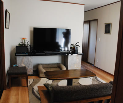 元の家にあった思い出のマントルピースの石材をちょっと加工してテレビ台として活用しています。 |